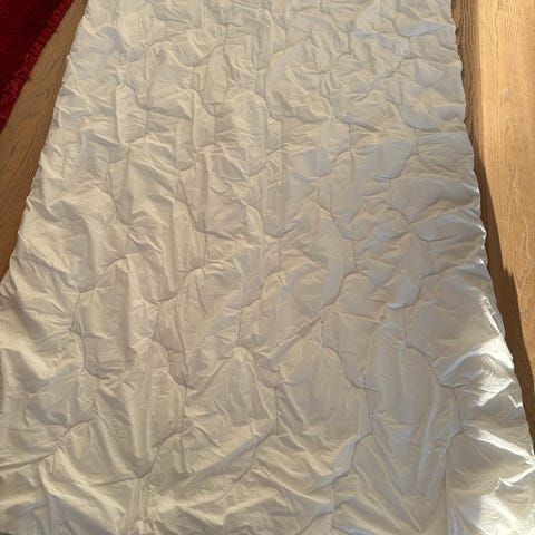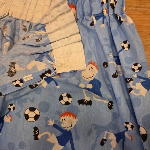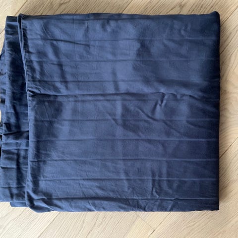 Bomull. Lysblått med hvite striper. Kan brukes på begge sider, hvor det på den andre siden er hvitt med lyseblå striper.