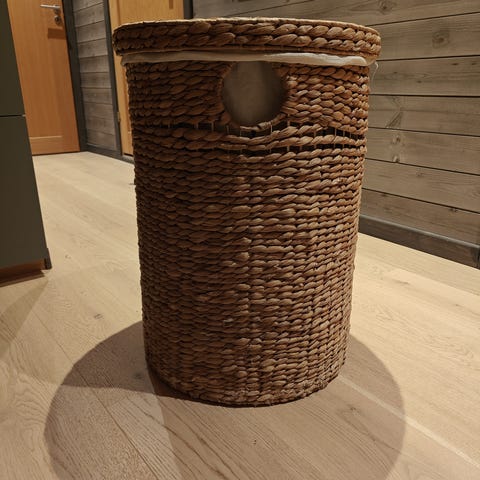 Skittentøyskurv i flettemønster med lokk. Bredde: 45 cm, dybde: 35, Høyde: 60 cm