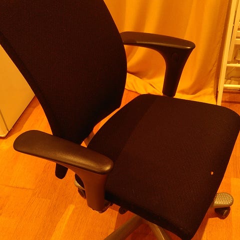 Swing back armlener. Det ene armlenet mangler knappen på for å justere høyde, og det har kommet en flekk på setet (muligens sjokolade). Dette skal ikke ha noe å si for stolen forøvrig. Masse stol igjen. :)