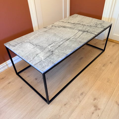 Vi vurderer å selge våres solide og stilrene sofabord med bordplate i ekte marmor og glassplate på toppen. Glassplaten er for å beskytte stenen men kan taes av
