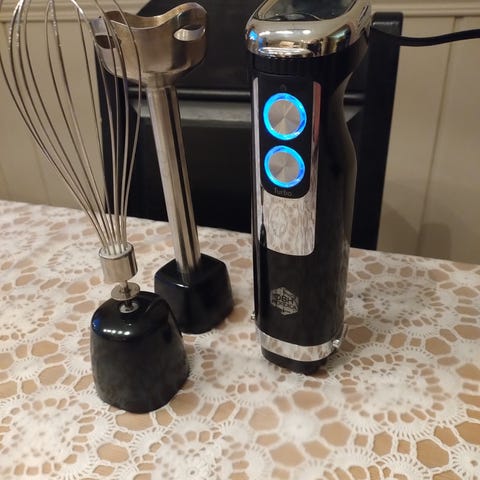 Bosch stavmikser med effekt på 280 W. Stavmikseren er hvit og har avtakbar stavdel med knivblad i metall. Egnet til miksing og purering av for eksempel supper, sauser og smoothies. Ledning for strømtilkobling. Enheten betjenes med knapp på håndtaket. Ingen ekstra tilbehør er synlig på bildene.