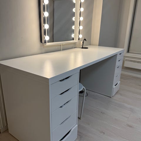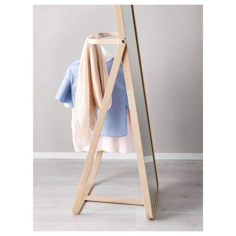 IKEA speil med stativ laget i ask. Speilet er frittstående og designet for å gi en full kroppsrefleksjon. For å slippe kleshaugen og ekstra klesvask, kan du henge brukte klær bak speilet.