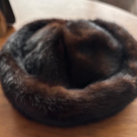 Mink hatt i fin eske. Klippet mink. Kan sendes i posten mot porto