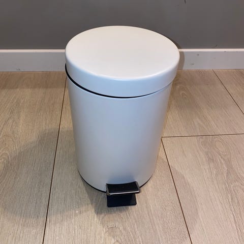 Pedalbøtte i hvit metall med lokk og pedal i metall. Passer godt som avfallsbøtte på bad, kjøkken eller kontor. Bøtten har pedal for håndfri åpning av lokket og en kompakt, sylinderformet utforming som gjør den enkel å plassere på små områder.