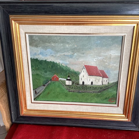 Maleriet viser et kirkelandskap med kirke, trær og allé inn mot bygningen. Bildet er innrammet i en dekorert treramme med mønster langs kantene. Malt av Borghild Haugerød.