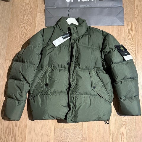 Stone Island genser for herre i størrelse M. Genseren er laget i bomull og har beige farge. Stone Island-logo på venstre erme. Strøken genser.