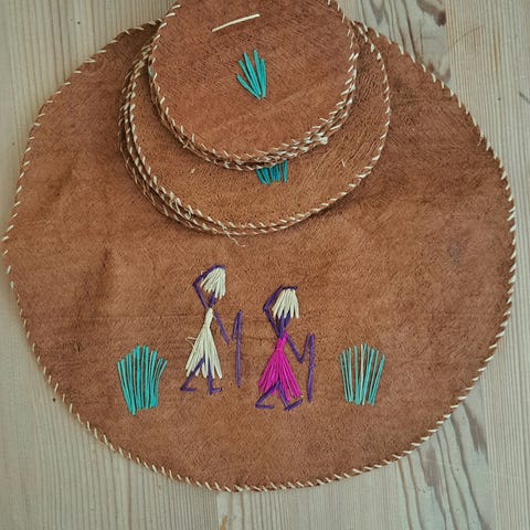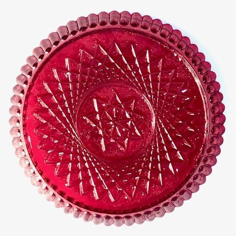 Dette er 2 gule plasplate eller skål med et stjernemønster og bølget kant. Fargen er en dyp, gjennomsiktig gul. Den har et intrikat presset glassmønster som stråler ut fra midten. Midten har et tydelig stjerne- eller blomsterlignende motiv. Kanten er dekorativt bølget eller perlet. Diameter 8,5 cm selges samlet