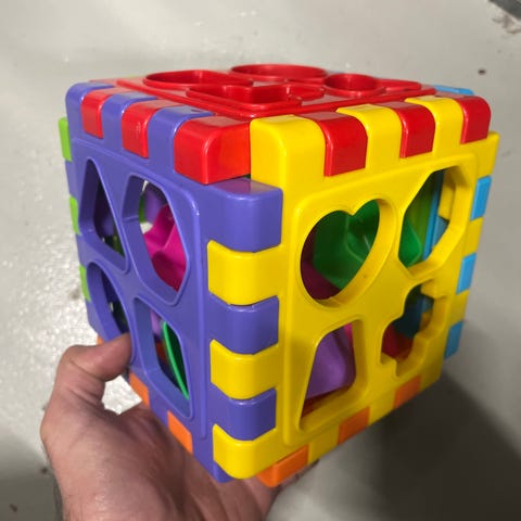 Fisher-Price stablekasse og formesorterer i plast med flerfargede klosser og lokk med ulike formåpninger. Settet består av en beholder med lokk der barnet kan legge klosser gjennom tilsvarende hull, samt stablebare bokser med motiver som tall, dyr og andre illustrasjoner. Leketøyet er egnet for små barn som øver på å kjenne igjen former, farger, tall og enkle motiver, samt trene finmotorikk og hånd-øye-koordinasjon.