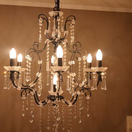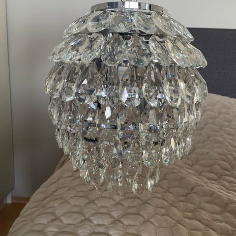 Lekker og unik lysekrone med bohemial krystaler kjøpt i Praha. Flere armer og hengende krystaler som gir et dekorativt lysbilde. Egnet som hovedbelysning i stue, spisestue eller andre oppholdsrom. Bruker flere lyspærer i stearinlysform. Monteres i tak. Oppheng er tilpasset lampens vekt.