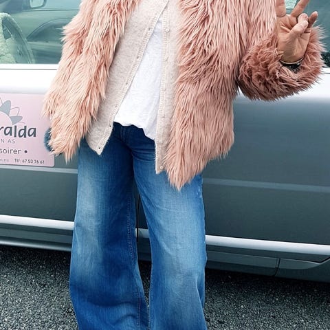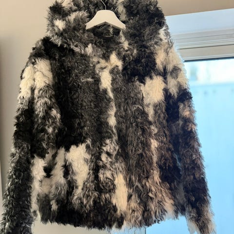 Rødt blikkfang av en fuskepelsjakke