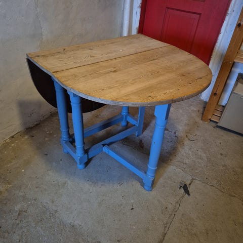 Et brunt bord med to klaffer som kan settes opp for å utvide det. Midten av bordet kan også trekkes fra hverandre for å utvide det ytterligere