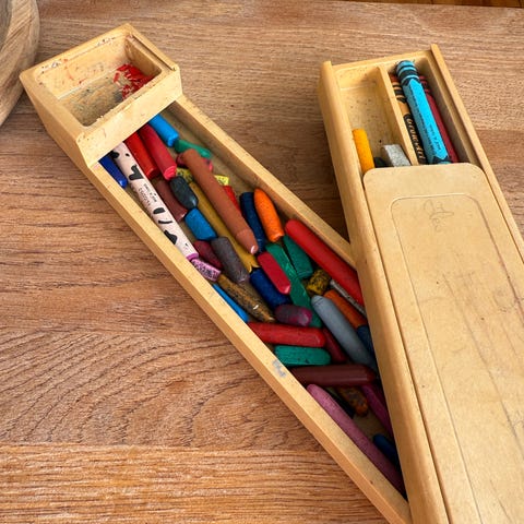 3 skrin med ubrukte oljefarger i 2 av skrinene mangler en tube.