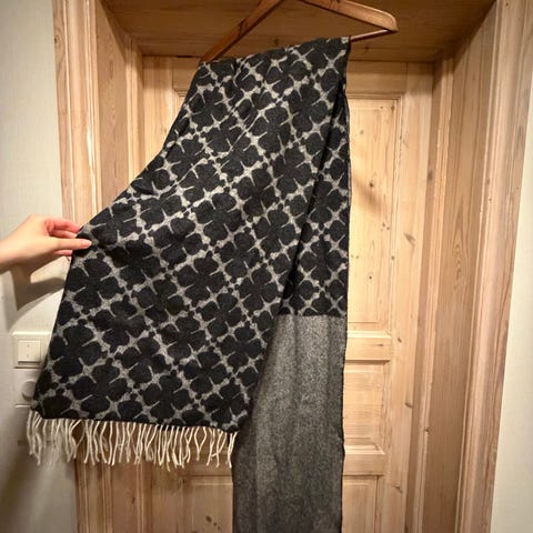 By Malene Birger skjerf i ull i gråtoner, one size. Skjerfet har karakteristisk mønster med kontrastfargede blomster-/kløverformede figurer og frynser langs kantene. Materialet er ull, og størrelsen er oppgitt som one size, egnet for dame. Skjerfet kan brukes både som hals- og skulderskjerf.