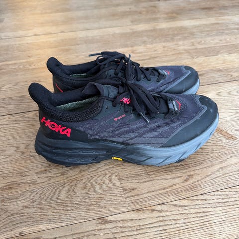 Hoka løpesko med Gore-Tex i størrelse 38. Skoene er svarte med snøring og kraftig mellomsåle som gir demping ved løping.