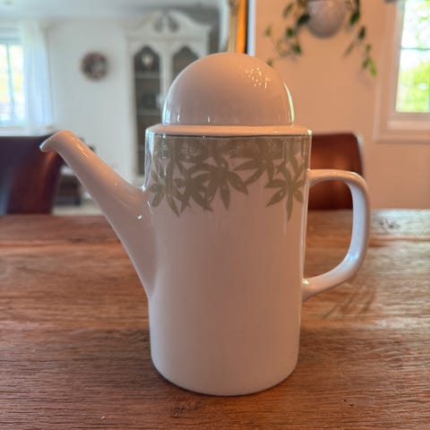 2 stk Porsgrund porselen tekanner med lys turkis dekor langs kanten selges samlet. Begge deler har firkantet form med avrundede hjørner og lokk. Tekannen har helletut og håndtak. Under delene er de merket med Porsgrund Porselænsfabrik.
