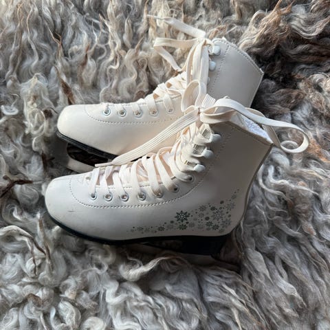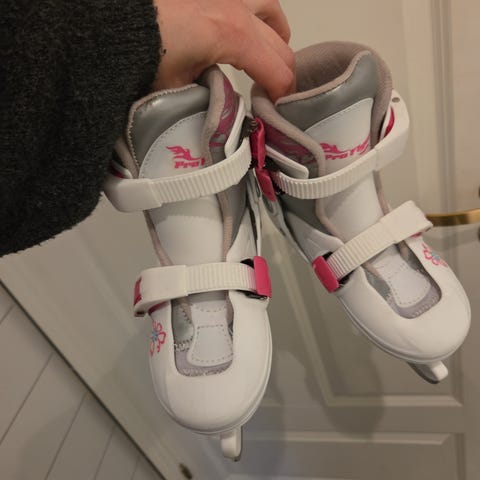 Justerbare svarte skøyter str 34-37. Defekt låsemekanisme 2 steder (se bilde 2), egner seg derfor dårlig for noen som skøyter ofte. For oss som kun har hatt sporadiske skøyteturer har dette vært enkelt løst ved bruk av strips som ble klippet av etter hver skøytetur. Kan sikkert også bruke tau eller borrelås som knytes/strammes rundt.