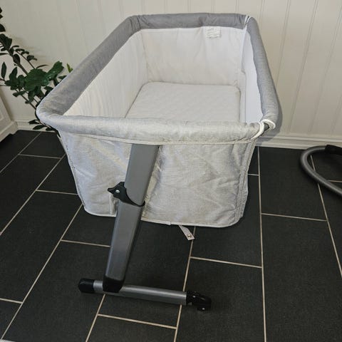 Yngri bedside crib i grå tekstil. Sengen har justerbart stativ i metall og myke, polstrede sider med nettingfelt som gir innsyn og lufting. Egnet som babyseng ved siden av foreldreseng eller som frittstående liten barneseng. Passer spedbarn i den første perioden, innenfor vekt- og aldersgrenser angitt av produsent.