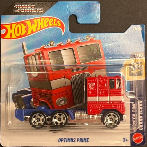 Hot Wheels Optimus Prime og Hot Wheels Porsche 911 Off-Roader lekebiler med tilhengere.