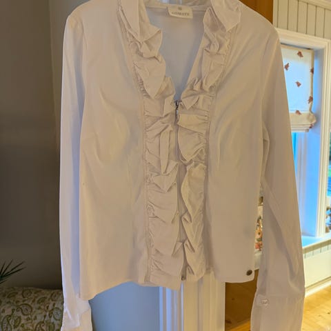 Armani Collezioni bluse for dame i størrelse M. Italiensk størrelse 44 som tilsvarer norsk 40. Passer er normal M og liten L. Blusen er kremhvit og laget av 100 % silke. Den har klassisk krage, knappelukking foran og volangdetaljer langs åpningen. Lange ermer med mansjetter. Har en liten misfarging, men det er absolutt usynlig ved bruk. Selges da den ikke passer meg lenger, men vil kanskje passe deg?