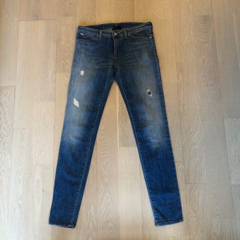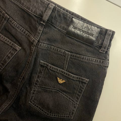 Armani Jeans damejeans i svart denim. Bukse med livvidde W30 og oppgitt størrelse L. Klassisk 5-lommers modell med glidelåsgylf og knapp i livet. Diskré Armani-logo på lomme bak og liten logo-detalj foran. Egnet til hverdagsbruk og kan kombineres med både enkle topper og mer formelle plagg.
