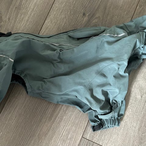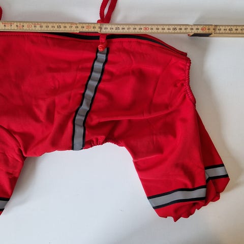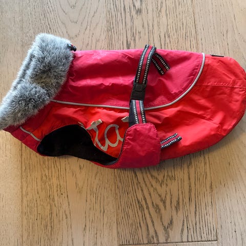Vannavstøtende, foret, hempe til hundebånd på ryggen og trykknapper under magen.