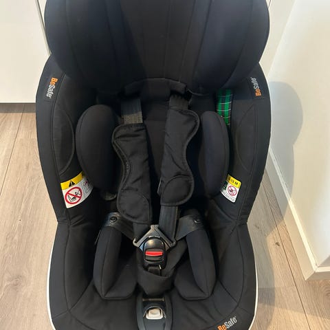 BeSafe barnesete i svart farge. Setet har integrert internsele og justerbar nakkestøtte. Det festes med base med støtteben og forankringsstropper, og er egnet for montering bakovervendt i bil. Trekket er polstret for økt komfort, og setet har sidebeskyttelse rundt hode og overkropp. Fra 6 månder til 7 år 36kg 125cm kjøpt nytt i 2024