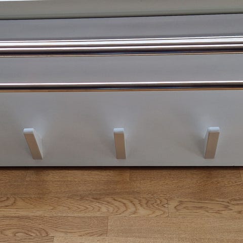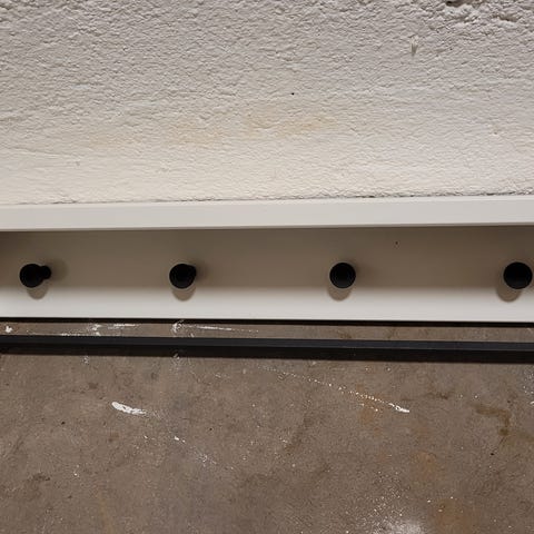 - Materiale: Hylle: MDF. Knagger: Poppel