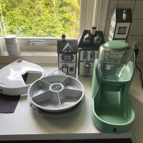 Klatrestativ for katt med flere nivåer og integrert hule i bunnen. Stativet er laget i lyst treverk med sisalomviklede stolper til kloring. liggeplatåene har avtakbare, polstrede puter i hvitt stoff og kan vaskes. Øverst er det en fin seng, med myk pute og en liten hengende lekeball. Nederst er det en lukket hule med åpning i front som kan brukes som sove- eller gjemmested. Passer for én eller flere katter som trenger kloremulighet, liggeplasser i høyden og et skjermet sted å hvile
