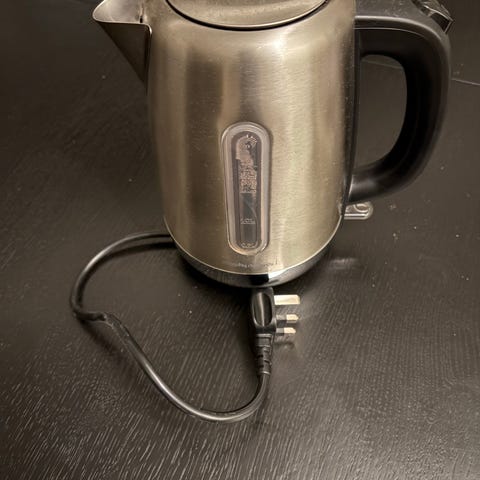 Philips vannkoker i rustfritt stål med svart plastdetaljer. Vannkokeren har håndtak i plast og nivåindikator på siden. Den står på en 360° roterbar sokkel med strømledning. Egnet til koking av vann til te, kaffe og annen matlaging der varmt vann trengs.