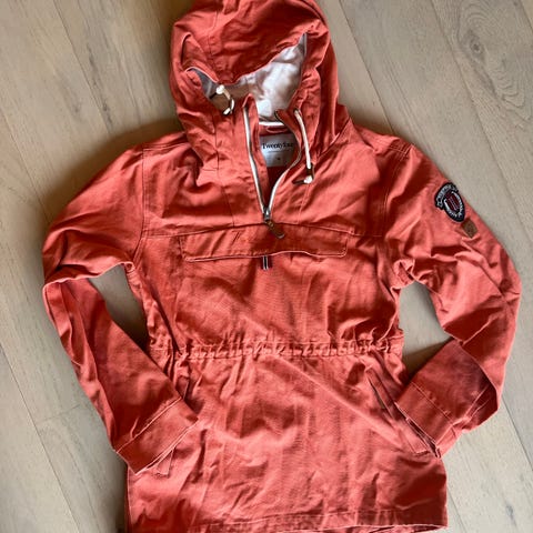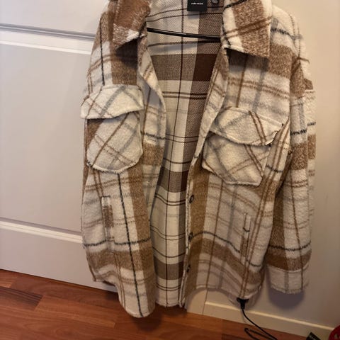 Vero Moda jakke for dame i størrelse M. Den har hette med fuskepelskant, frontlukking med glidelås og trykknapper, samt lommer foran. Passer fint til kaldt høstvær/mildt vintervær.