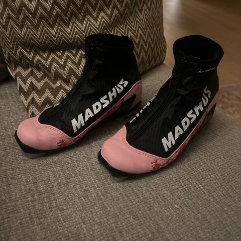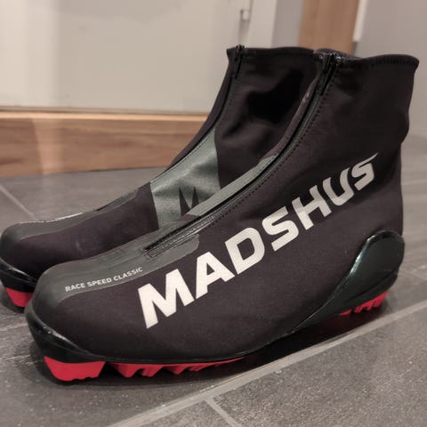 Madshus F19 Race Speed Classic langrennsstøvler i størrelse 41 EU. Modellen er en klassisk langrennsstøvel med snøring og glidelås i front, samt overtrekk som beskytter mot snø og fukt. Skoene har svart og rød farge med hvite detaljer. Yttersålen er tilpasset klassisk bindingstype (NIS/NNN-lignende system, se bilder for detaljert såleutforming). Innvendig fôr gir ekstra komfort og varme. Egnet for klassisk langrennstrening og turbruk.