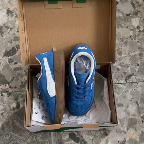 Puma Palermo Vintage Jr joggesko for barn/unisex i størrelse 36. Modellen har overdel i tekstil og semsket materiale i hvit med svarte detaljer og klassisk Puma-logo på siden og hælen. Yttersåle i gummi. Snøring foran for justerbar passform. Egnet som fritidssko til hverdagsbruk.
