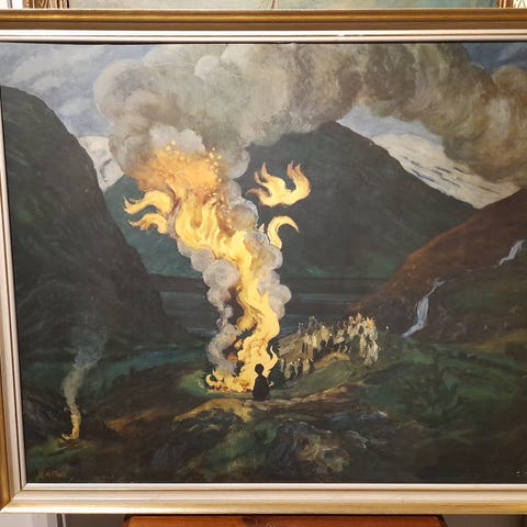 Nikolai Astrup Jonsokbål innrammet bilde. Motiv av jonsokbål med mennesker samlet i et dal- og fjordlandskap, med fjell, vann og røyk fra bålet. Bildet er montert i lys, profilert ramme med passepartout og navnskilt nederst på rammen som angir kunstnerens navn, motivtittel «Jonsokbål» og årstall 1917. Egner seg som veggdekorasjon i stue, gang eller andre oppholdsrom.