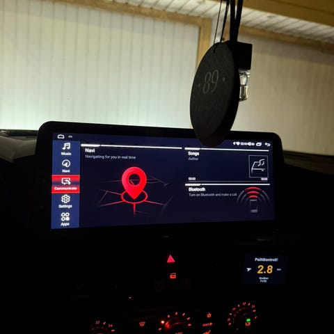 CarPlay Android Auto multimedieskjerm til BMW. Enheten erstatter eller oppgraderer original skjerm i dashbordet og gir tilgang til funksjoner som navigasjon, musikkavspilling og telefonintegrasjon via Apple CarPlay og Android Auto. Pakken på bildene viser skjerm med front- og bakside samt tilhørende strøm-, USB- og AUX-kabler for tilkobling til bilens eksisterende anlegg. Skjermen er beregnet for montering i BMW-modeller med originalt infotainmentsystem som vist på bildene. Nøyaktig kompatibilitet og skjermstørrelse avhenger av bilmodell og årsmodell og bør kontrolleres før montering.