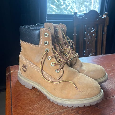Timberland støvler i størrelse 35 (store i størrelse, passer noen som bruker 36-37. Modellen er laget i ekte skinn. Fargen er svart, og støvlene har snøring foran og kraftig mønstret såle for godt grep. Passer til hverdagsbruk og utendørsaktiviteter i kjøligere vær.