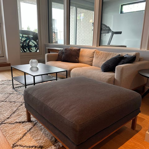 Bolia North sofa med sjeselong, Bolia Phillippa stol med fotskammel og bord fra Bohus