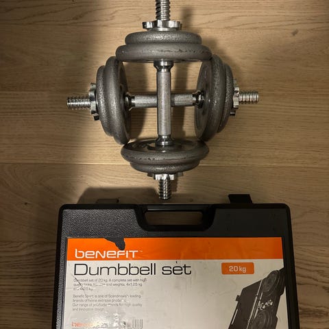 Dumbbell Set manualsett på 20 kg. Settet består av to korte vektstenger med gjengelås og flere løse vektskiver som kan kombineres for å tilpasse belastningen. Leveres i koffert for enkel oppbevaring og transport.