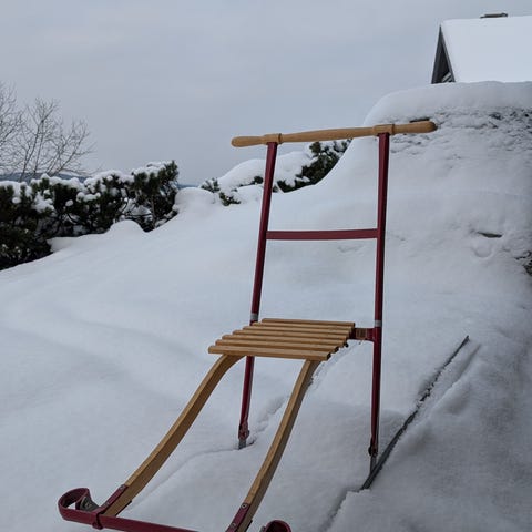 Eldre hel og fin Nansen sparkstøtting i tre. Klassisk modell med tresete og stålrunners som er noe rustet