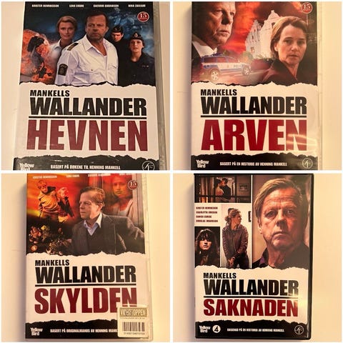 Mankells Wallander DVD samleboks med flere episoder av krimserien om politietterforsker Kurt Wallander. Coveret viser titler som «Luftslottet», «Blodsbrødre», «Forfalskeren», «Hemmligheten», «Fotografen», «Håststorm» og «Dekkoperasjonen». Format: DVD. Sjanger: krim/drama. Egnet for de som samler på eller ser nordisk krim på DVD.