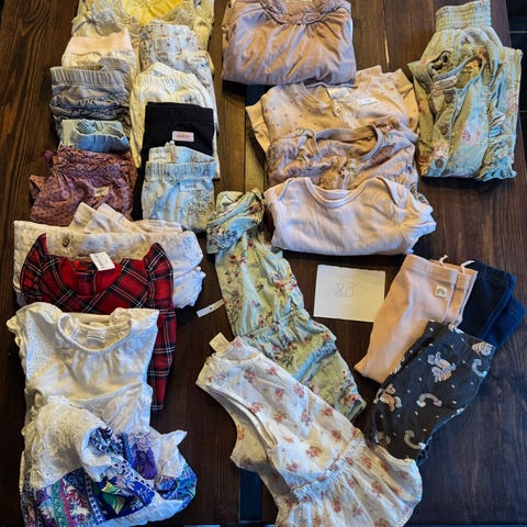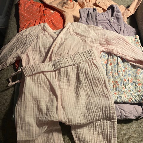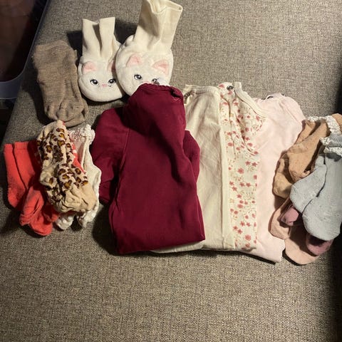 Pakke med ytterklær i str. 74-86. Dresser, jakker, votter, luer og regntøy.