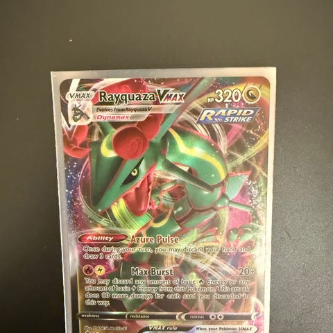 Et vmax rayquaza kort tatt ut av perm noen ganger. Har litt bruksmerker på siden det kan sees på bildet. Kortet er verdt 760 kr.