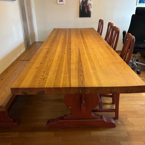 Pent brukt. Består av bord 140 cm - 2 stk ilegg plater a 55 cm - vitrineskap med innvendig ly