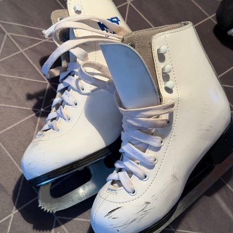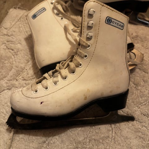 Cycab kunstskøyter for barn i størrelse 27. Skøytene er hvite med snøring foran og sort hæl. Egnet til generell skøytebruk og lek på is for barn som bruker størrelse 27 i skøyter. Skøytene har klassisk kunstskøytedesign med tagger foran på stålet for bedre feste i isen.