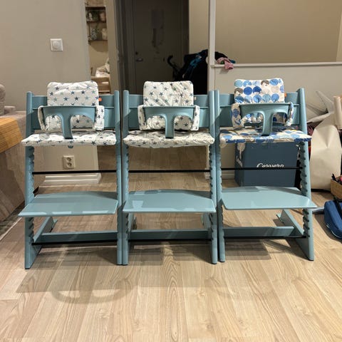 Selger denne fine Stokke stolen i fargen stormgrey. Stolen er pent brukt, men det forkommer brusmerker i lakken ettersom den er brukt. Men ingen skader eller feil. Stolen medfølger matchende babyset, brett og tippesikring. Putesett med stjerner. Ustyret er som nytt!