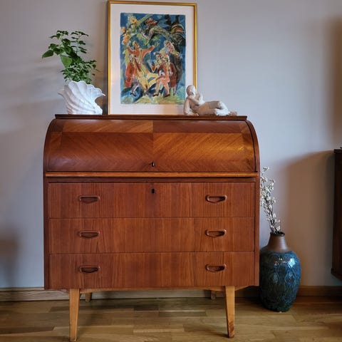 Selger mitt kjære teak-skatoll pga. flytting. Selger det billig da det trenger en del kjærlighet, eller å ha blitt oppbevart ute i en garasje i ett år under utenlandsopphold. En av skuffene må bankes på plass, og det har nok godt av runde behandling.