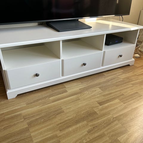 Hvit Hemnes TV-benk med 3 skuffer selges rimelig da vi ikke har behov for den lengre.