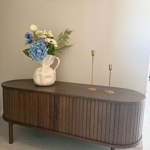 TV-benken har noen bruksmerker, men fremstår i god stand.