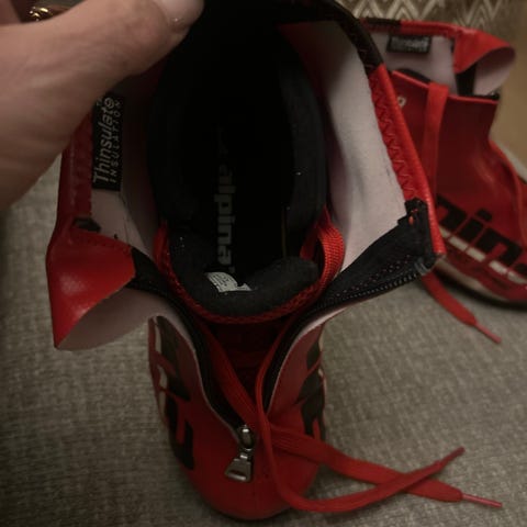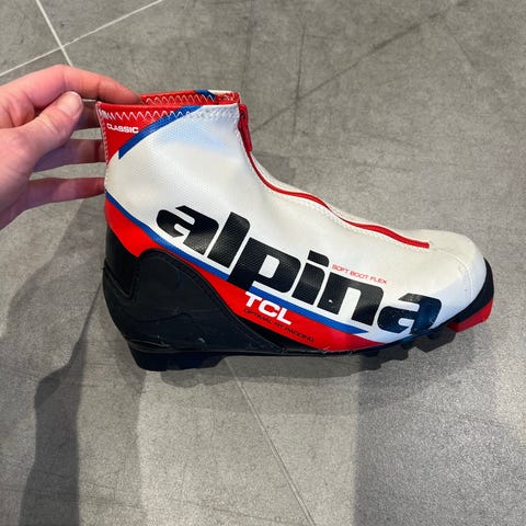 Alpina langrennssko i størrelse 35. Modellen er en junior langrennsstøvel med overdel i syntetisk materiale og tekstilfôr. Fargene er hvit, rød og svart med røde lisser og borrelåsstropp øverst for bedre tilpasning. Sålen er grovmønstret for godt feste ved gange uten ski. Støvlene er beregnet for klassisk langrenn for barn/junior. Passer til bruk med kompatibelt binding- og skitype som støtten er laget for.
