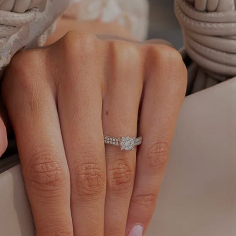 Dette er en elegant og tidløs ring med klassisk halo-design og slank pavÊ-ringarm. Emerald-slip gir et eksklusivt og sofistikert uttrykk som skiller seg tydelig fra tradisjonelle briljanter.