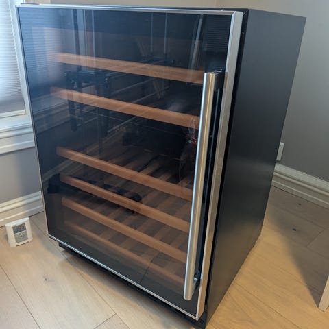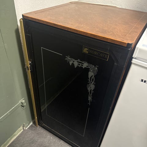 Vinskapet fungerer, men det durer i vifta. Så må justeres eller fikses. Bruker det ikke, så orker ikke styre med et. Plass til 24 flaske.